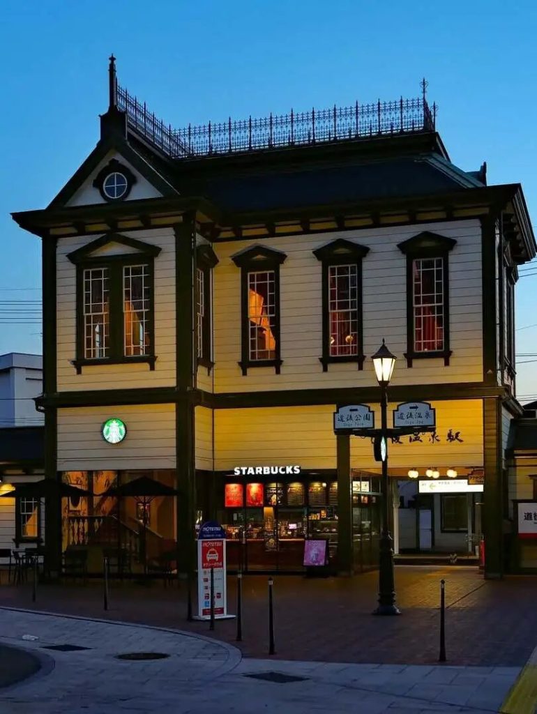 車站裏還藏著一家星巴克,老座椅、複古窗,點一杯咖啡坐在靠街的位置,看著窗外人來人往,咖啡香混著溫泉小鎮特有的松弛感,一下子就把旅途的疲憊熨帖平整。