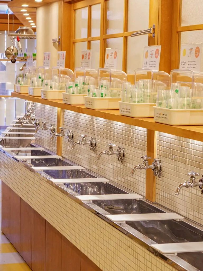 愛媛縣都市傳說——“”橘子汁水龍頭”。伊織本店在館內設置了五款橘子水龍頭,你只要先去櫃台付款後就可以拿到三個杯子,挑選想嘗試的橘子品種,打開牆面上的水龍,就會有源源不絕的橘子汁流出,真的很神奇!