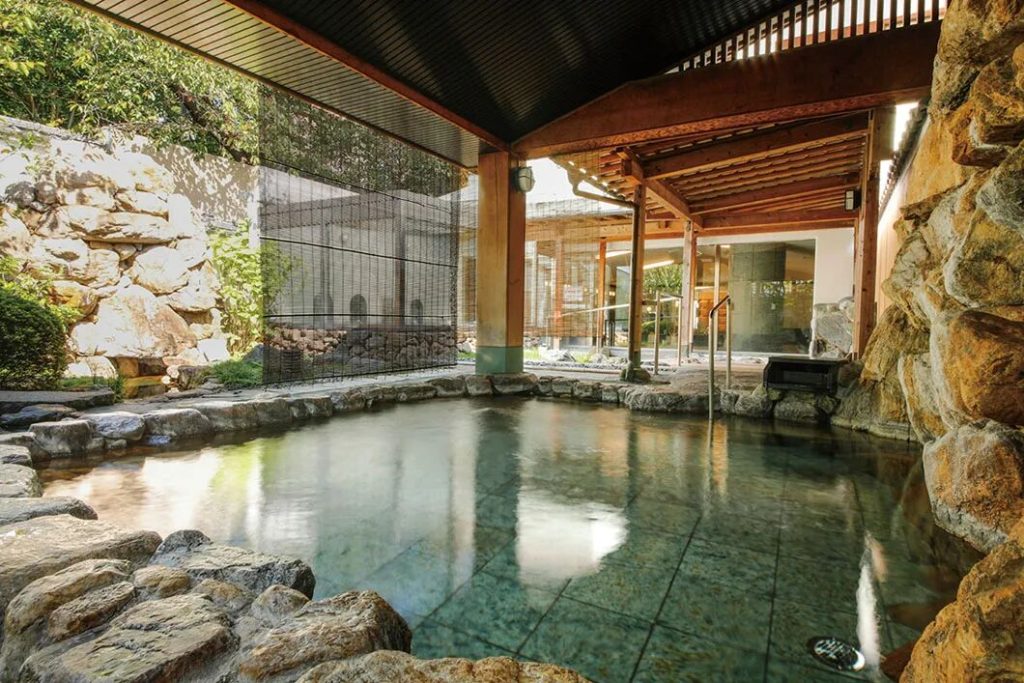引自道後溫泉的泉水,酒店內設置兩座露天大浴場,「檜湯」能置身於檜木香味中入浴,「禦影湯」則設有兩座使用伊予大島石打造的花崗岩浴池,為早晚男女輪流入浴制。