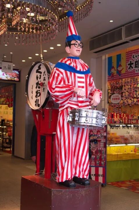 在中座食倒大樓(中座くいだおれビル)的入口處,大阪的標志性人物——“食倒太郎”正敲鑼打鼓,熱情迎接大家的到來!