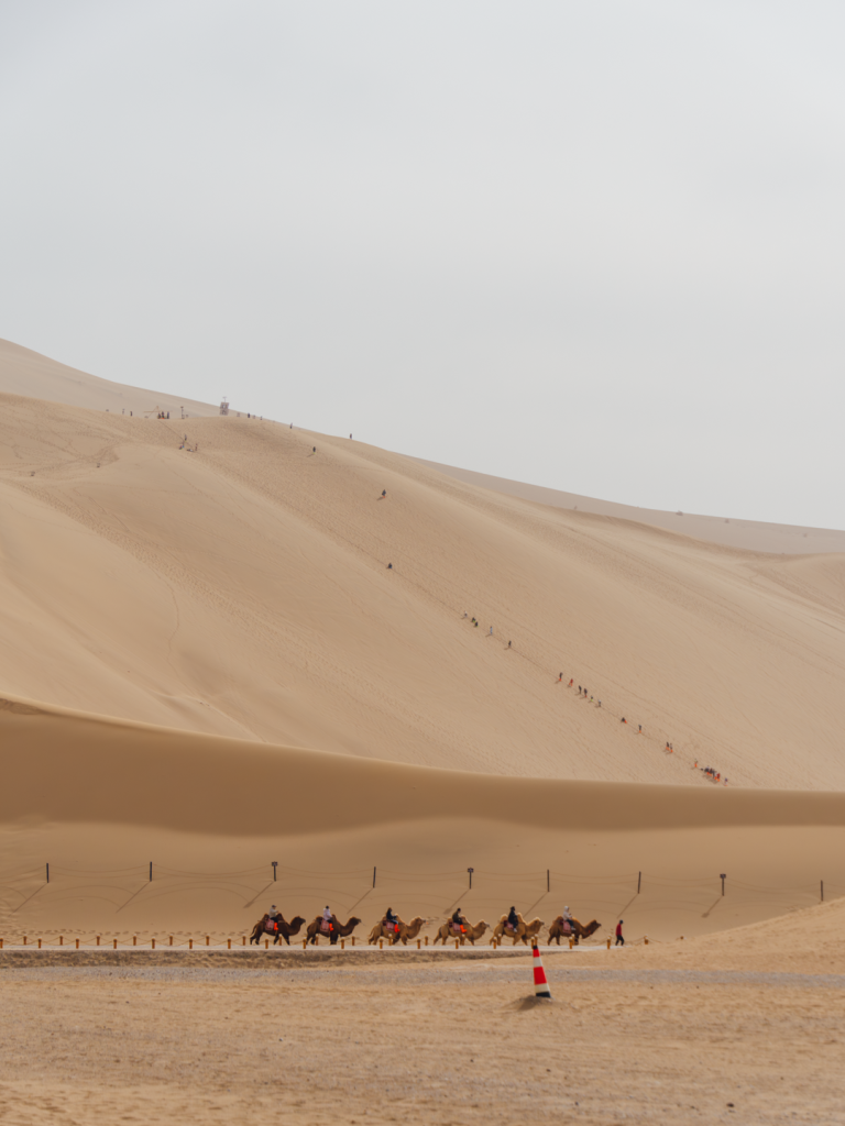 鳴沙山和月牙泉兩個景區連在一起,景區門票3天內有效的。裏面還有很多遊玩項目:大漠乘駝、滑沙、沙漠摩托車、沙漠越野車、直升機、滑翔機等。到了暑假每天晚上還會有萬人星空演唱會,現場人山人海,演出前大家會先把五星紅旗一起抬到中央,儀式感滿滿,來感受一場大西北的浪漫。