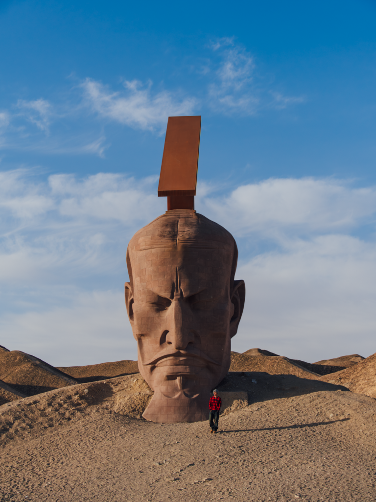 這是青年雕塑家張萬興以絲綢之路為背景創作的戶外雕塑作品,也是“荒野藝術計劃”的一部分。這座高達12.5米的武帝胸像,仿佛沉思的漢武帝面朝公路,背後一大片高低起伏的沙丘,坐落在河西走廊,對於了解曆史具有重要意義。