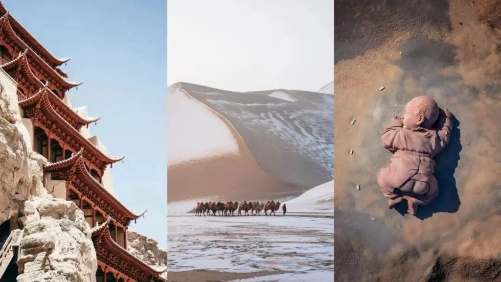行駛在瓜洲戈壁灘,你會偶遇一個俯臥酣睡的嬰兒,邂逅一座純白鏤空的唐式建築......這是進入了奇妙的夢境,還是闖入了海市蜃樓?別驚訝,這裏是瓜州國際雕塑藝術長廊,一路上有好幾個熱門雕塑,拍照最出片的還屬下面這3個。