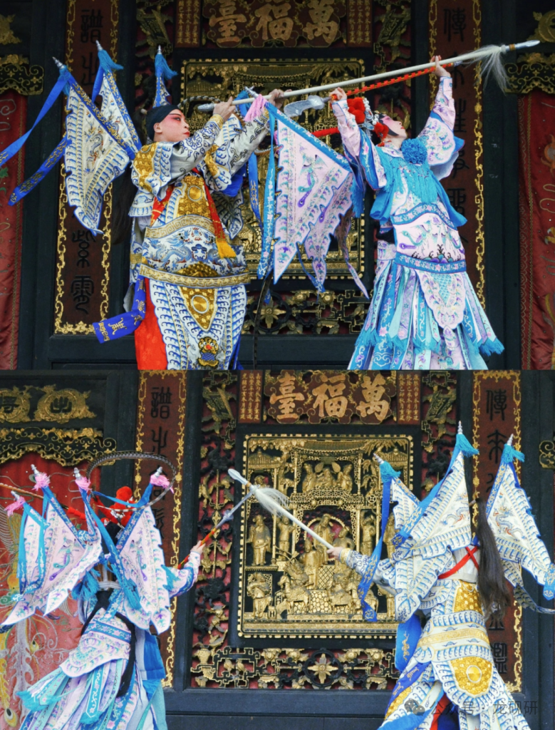 萬福台上紅底金漆“萬福台”匾,兩側記錄著“康熙、乾隆、嘉慶、鹹豐、光緒”的曆代重修、重建信息。匾下嵌木刻篆書對聯“傳來往事留金鑒,譜出高歌徹紫霄”。粵劇被譽為南國紅豆,佛山是粵劇的發源地,萬福台又是海內外紅船弟子尋根的重要場所。昔日戲班會每年組班一次乘紅船外出四鄉演出,為祈求北帝保佑旅途平安,組班後的首場演出必選在萬福台,遂使萬福台日漸兼具了粵劇審戲台的重要作用,見證著粵劇在佛山的曆史與發展。