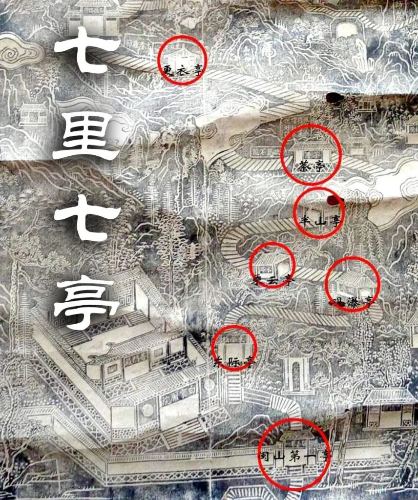 從山腳向上依次為:東際亭,佛蔭亭,觀瀑亭,乘雲亭,半山亭,觀音亭,松關亭,更衣亭。除了佛蔭亭與觀音亭,剩餘的六亭與位於寺廟中的駐錫亭合稱為“七里七亭”,曆史最早可追溯至唐宋年間,是古道沿途重要的曆史風景。其中,更衣亭更是被評為了區級保護文物。