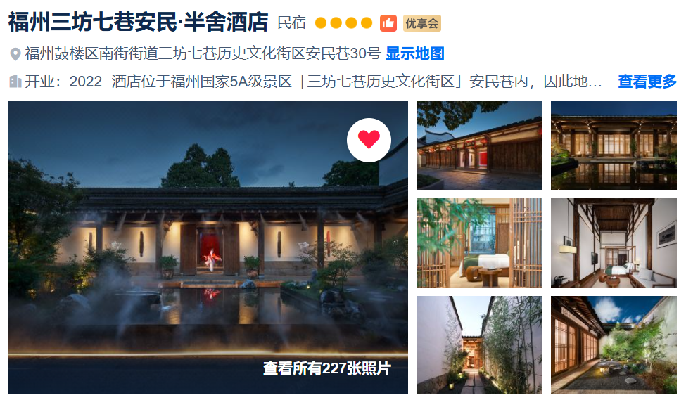 酒店介紹:地處三坊七巷,鬧中取靜,庭院式的客房,中式設計,客房內擁有獨立的茶空間和小花園。