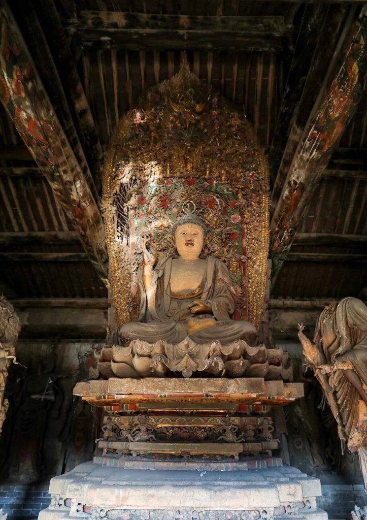 主殿內有28尊彩塑,主佛是釋迦牟尼佛,他的左右兩側分別為文殊和普賢菩薩,釋迦牟尼佛背光懸塑華美、精致、金碧輝煌,兩尊菩薩已經殘破,個人會認為是脅侍菩薩。