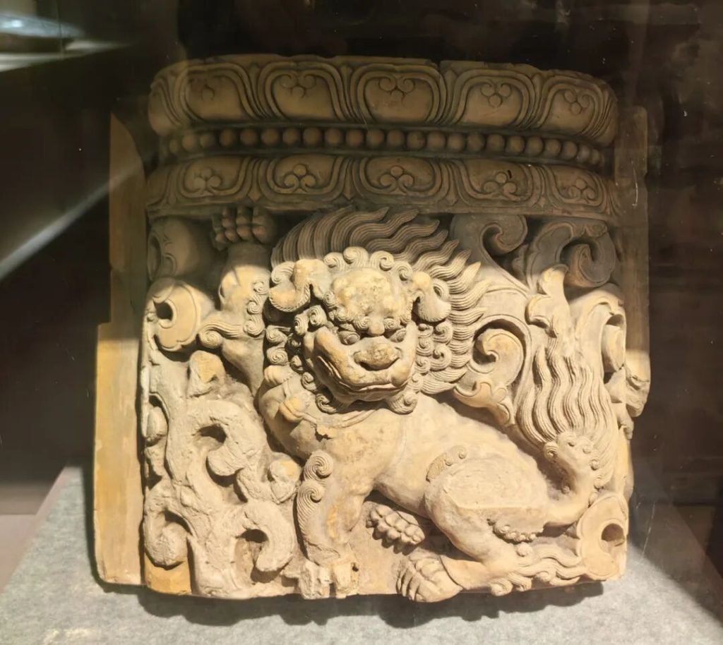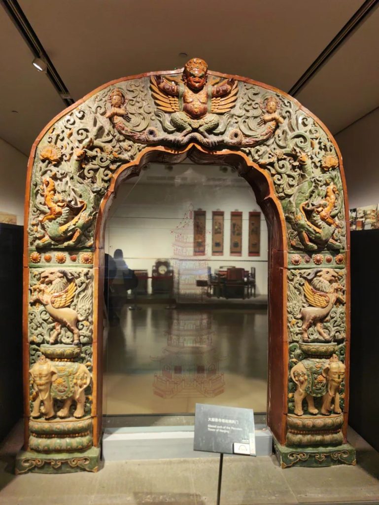 還值得介紹的是現藏於南京博物院的大報恩寺琉璃塔琉璃拱門。此拱門是由燒造琉璃塔的琉璃窯專為日後維修所預留的備件,1958年出土於南京中華門外琉璃窯舊址,由專家們複原組裝完成。琉璃塔拱門上的動物組合,被稱為“六拏具”,這一法相裝飾源自藏傳佛教。它們常被置於佛教背光和佛寺券門之上,以大鵬金翅鳥為中心,兩側依次為龍女、摩羯魚、飛羊、獅子、白象,這一組合又被稱為“六靈捧座”或“六靈捧會”,每一種形象都蘊含著深刻的寓意。由這個拱門,可以想象當年琉璃塔的壯美。