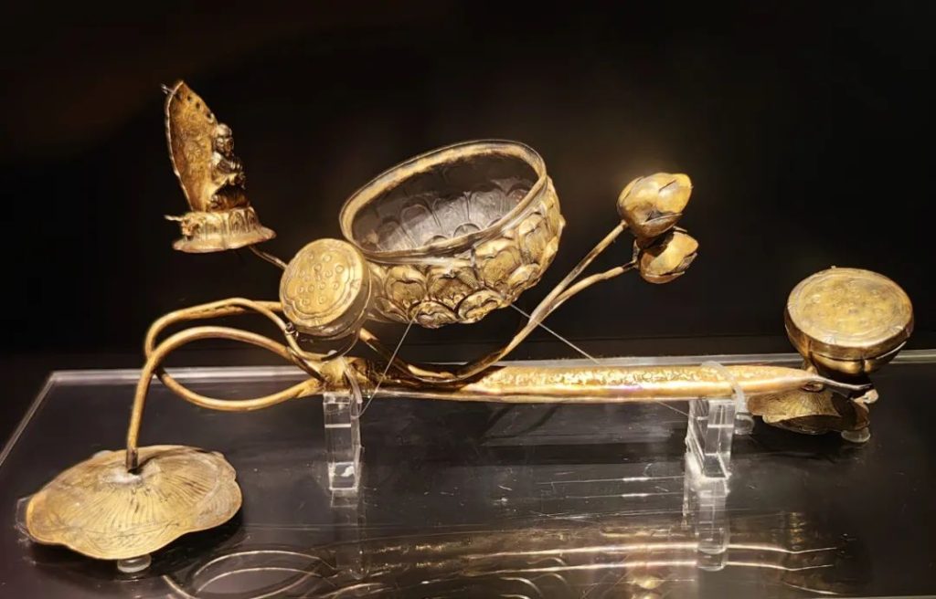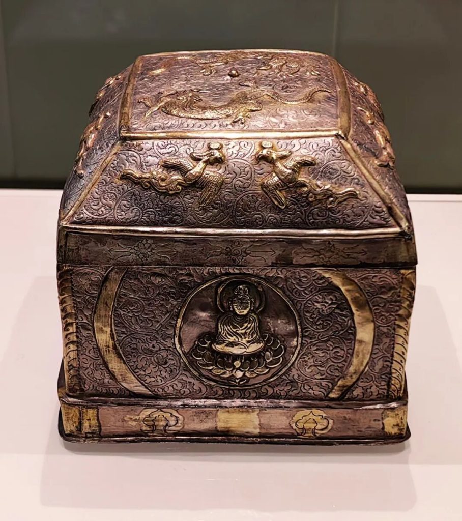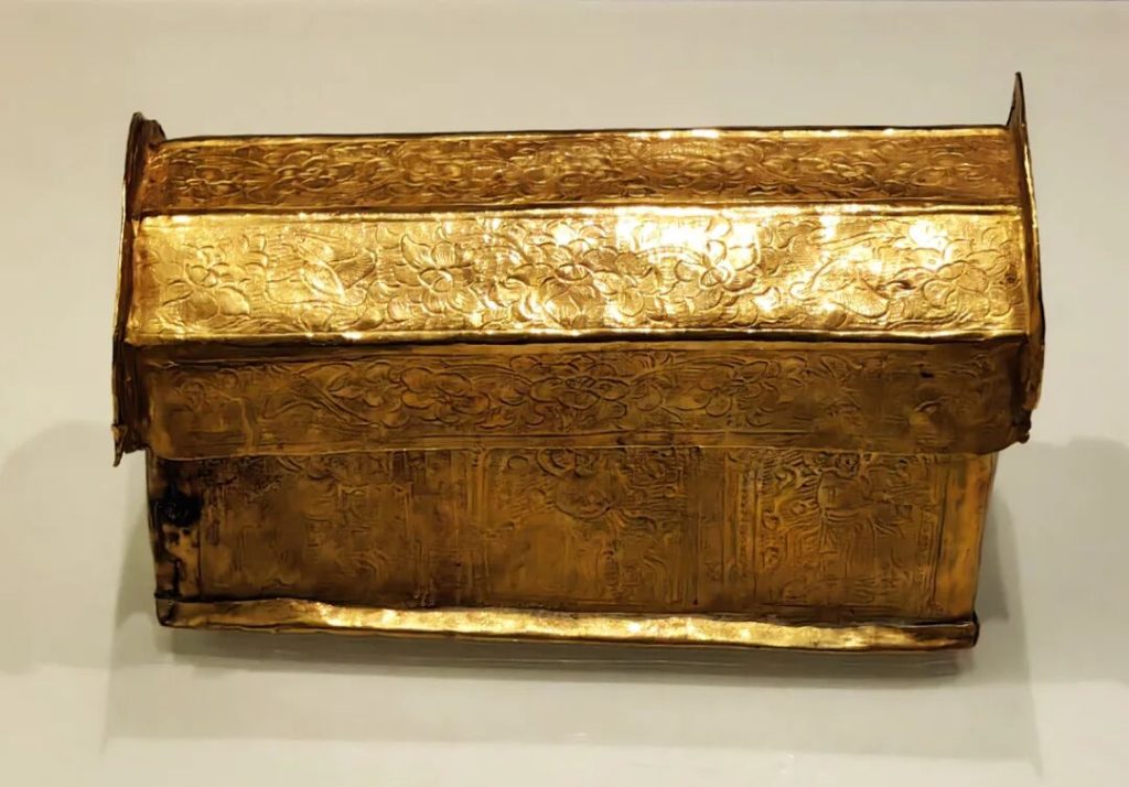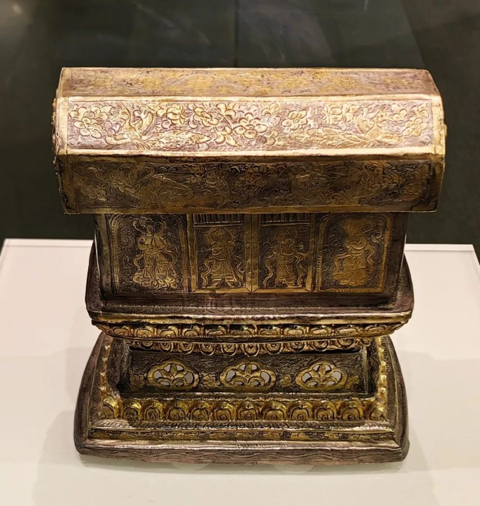 地宮中出土的金棺以純金制成,由棺蓋和棺體兩部分組成,兩端以金絲捆紮。金棺表面鏨刻纏枝蓮紋、鸞鳥和神像。銀槨局部鎏金,由長方形槨體和須彌底座構成,表面以捶揲、鏨刻等方法表現紋飾。
