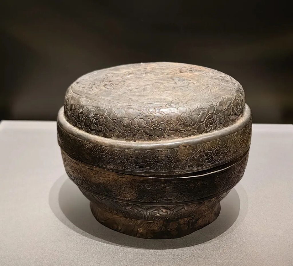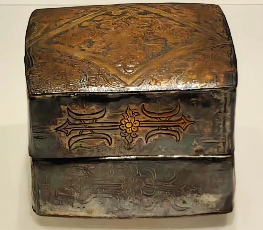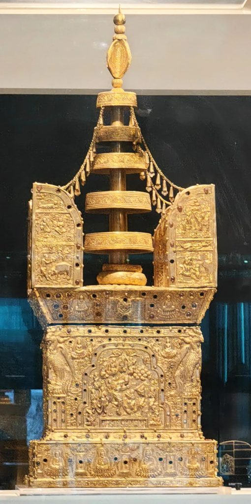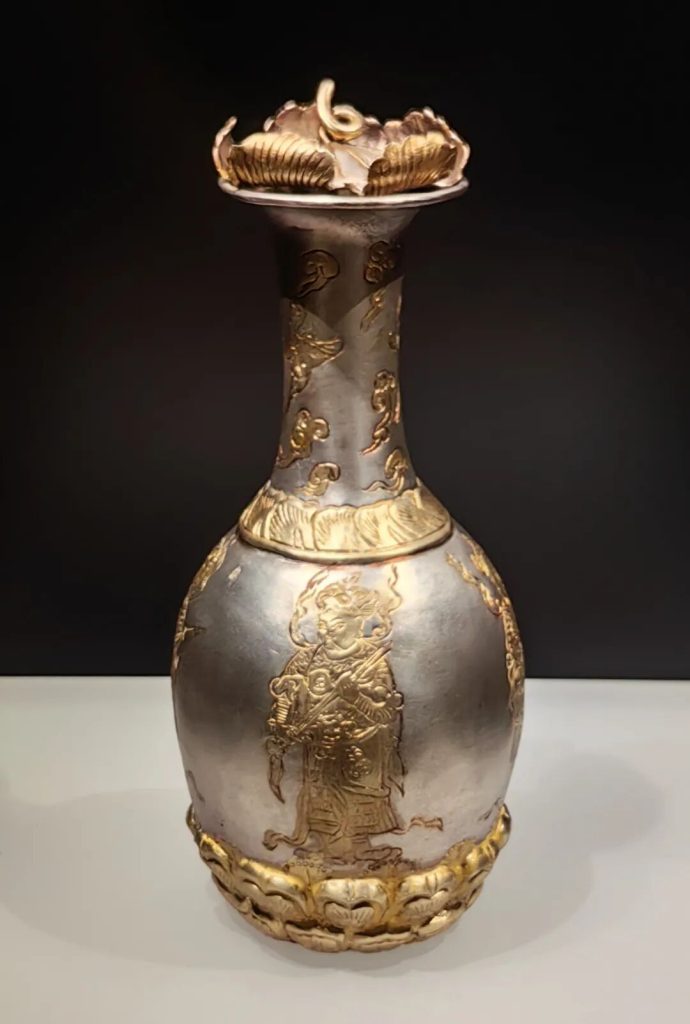 地宮中出土的金棺以純金制成,由棺蓋和棺體兩部分組成,兩端以金絲捆紮。金棺表面鏨刻纏枝蓮紋、鸞鳥和神像。銀槨局部鎏金,由長方形槨體和須彌底座構成,表面以捶揲、鏨刻等方法表現紋飾。