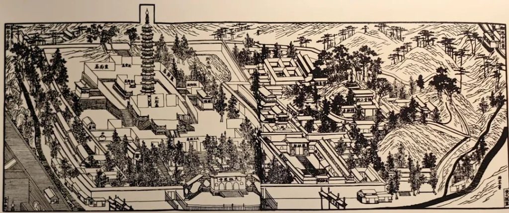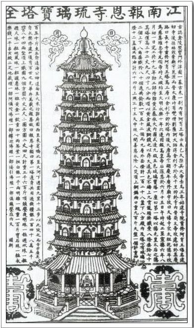 明代初年至清代前期,大報恩寺琉璃寶塔作為南京最具特色的標志性建築物,被稱為“天下第一塔”, 也是當時中外人士遊曆金陵的必到之處。明代文人張岱評琉璃塔雲:“中國之大古董,永樂之大窯器,則報恩塔是也。報恩塔成於永樂初年,非成祖開國之精神,開國之物力,開國之功令,其膽智才略足以吞吐此塔者,不能成焉。塔上下金剛佛像千百億金身。一金身,琉璃磚十數塊湊砌成之,其衣折不爽分,其面目不爽毫,其須眉不爽忽,鬥筍合縫,信屬鬼工。”