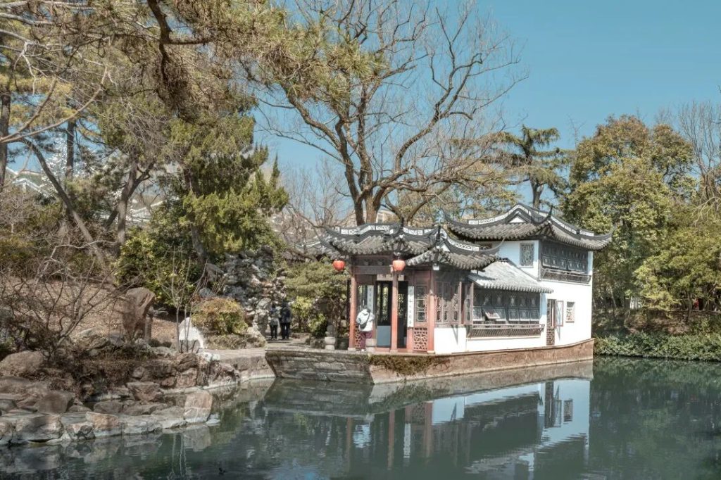 又名書畫舫,俗稱石舫。始建於明嘉靖初期,位於戲鵝池北岸,三面臨水。舟名出自白居易《適意》:“豈無平生志,拘牽不自由。一朝歸渭上,泛如不系舟。”建成後,明代書法名家、“吳中四才子”之一的祝允明遊覽猗園,為石舫題“不系舟”額,遂聲明遠播。“猗園戲鵝”“舢舫觀魚”為“南翔八景”中的兩景。