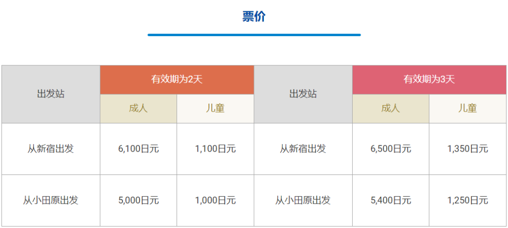 下面我來介紹周遊券的內容、價格。從天數上分有2天和3天的(區別於一個是2天有效,一個是3天有效,其他所含內容一樣);從出發地分,有從新宿出發和小田原出發,小夥伴們看自己的行程安排,希望我的文章可以讓你選擇到最適合自己的套餐。