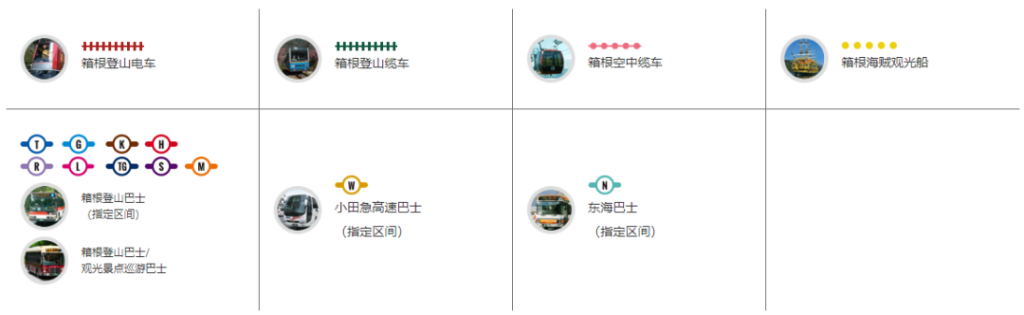 點擊可放大圖片:套票可以乘坐的交通工具:箱根登山電車、箱根登山纜車、箱根空中纜車、箱根海賊觀光船、箱根登山巴士(指定區域)/觀光景點巡遊巴士、小田高速巴士(指定區域)、東海巴士(指定區域)