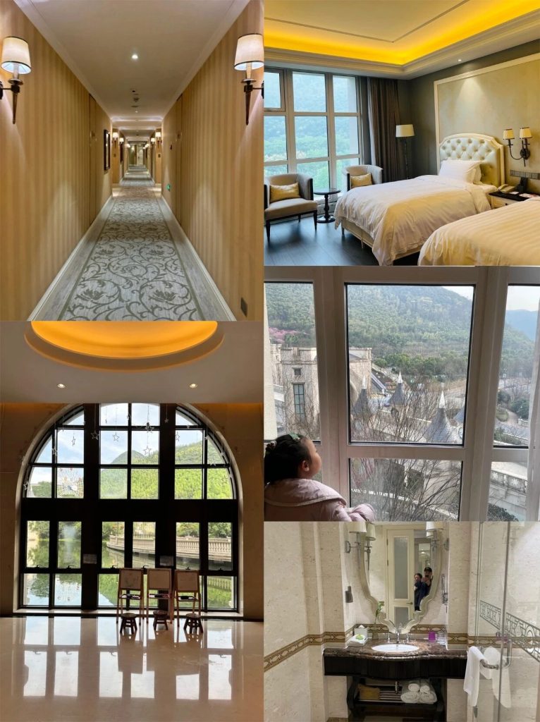 酒店大門前的歐式拱橋;二樓通往樂園的連廊(夜晚燈光亮起時格外夢幻);房間窗邊與摩天輪合影。