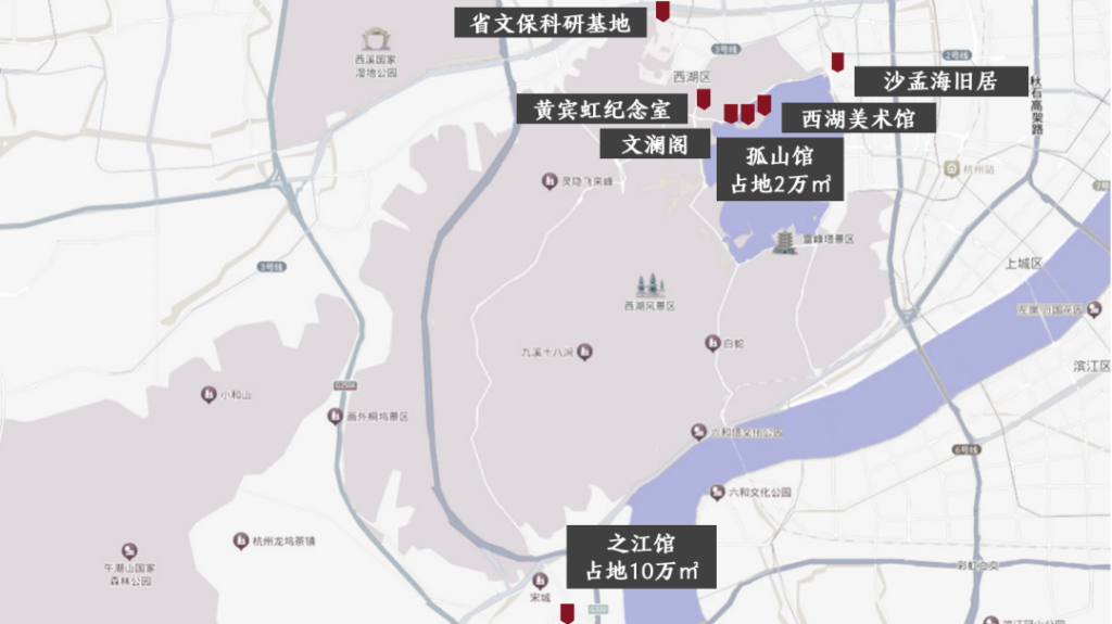 浙江省博物館分為孤山館區、文瀾閣、西湖美術館、武林館區(已於2023.5.4閉館)、黃賓虹紀念室、沙孟海舊居、文保科研基地七個部分,位置關系如下圖。