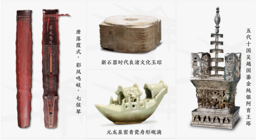 館藏文物品類繁多,年代序列也相當完整,更有如良渚文化玉琮、《富春山居圖》、七弦琴等國寶級珍品。