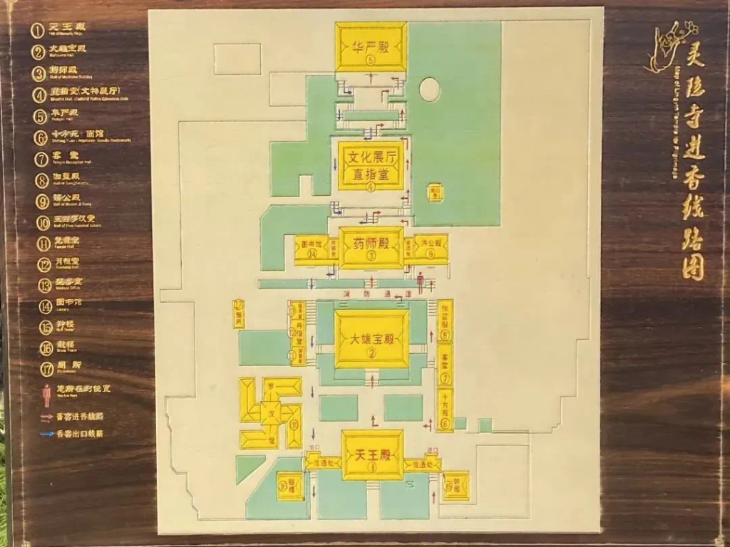 靈隱寺主要由天王殿、大雄寶殿、藥師殿、直指堂、華嚴殿為中軸線,兩側為羅漢堂、濟公殿、華嚴閣、等建築,殿宇恢弘,建構有序。