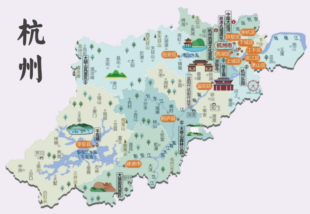 杭州,古稱錢塘,位於浙江省東北部,東南沿海、錢塘江下遊北岸、京杭運河南端,西部群山起伏(最高峰達1700多米),東部河網密布。