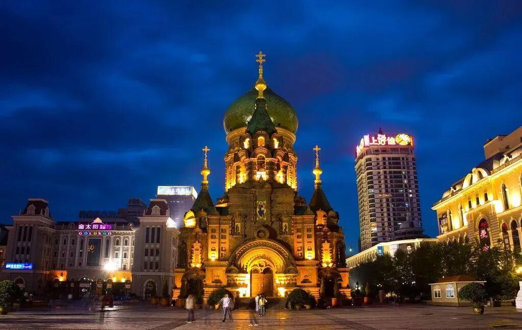 聖索菲亞大教堂是哈爾濱的地標性建築,綠色的洋蔥頭式大穹頂十分引人注目。與白天相比,教堂的夜景更美麗。