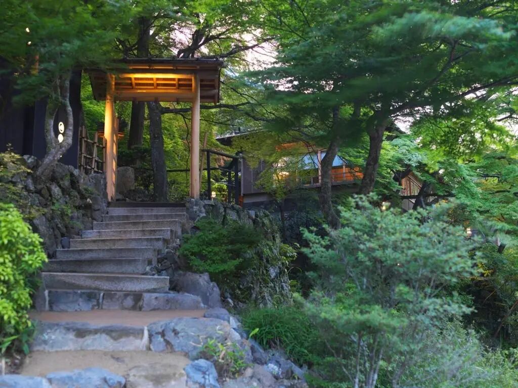 77間客房分為水波屋,山間屋和庭院屋,散落在湖邊山麓,經由小橋、流水、樹道、草徑相連接。每家庭院都有小景,幽靜的楓葉林,小橋流水的設計,不像是家高端酒店,而是江戶時代的日式庭院。