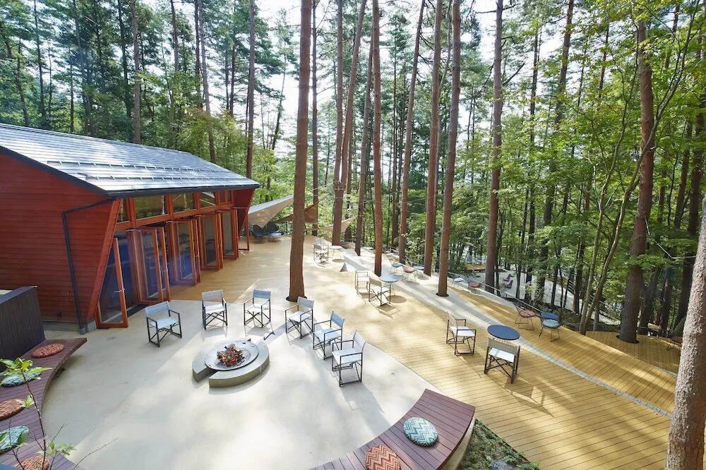 酒店坐落在山梨縣富士河口湖町的山腰之上,擁有100米左右的落差,如同隱藏在森林中一般。以“Glamping(豪華露營)”為特色,山梨縣的這家虹夕諾雅格外與眾不同,非傳統式的酒店或別墅樣式,而是分成了三大區域:山下的接待區、客房區域、森林區域。