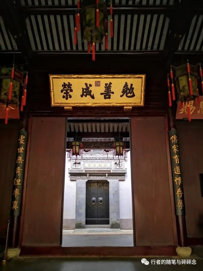 轎廳的梁柱采用的全是珍貴的銀杏,木門楣高懸幾個大匾:經商有道、承天恩賜、勉善成榮、奉揚仁風、樂善好施。門楣正中的匾額是勉善成榮,是同治皇帝親賜的禦匾,其中善字少了兩點,寓意善無止境,勉勵胡家多做善事來成就榮耀。
