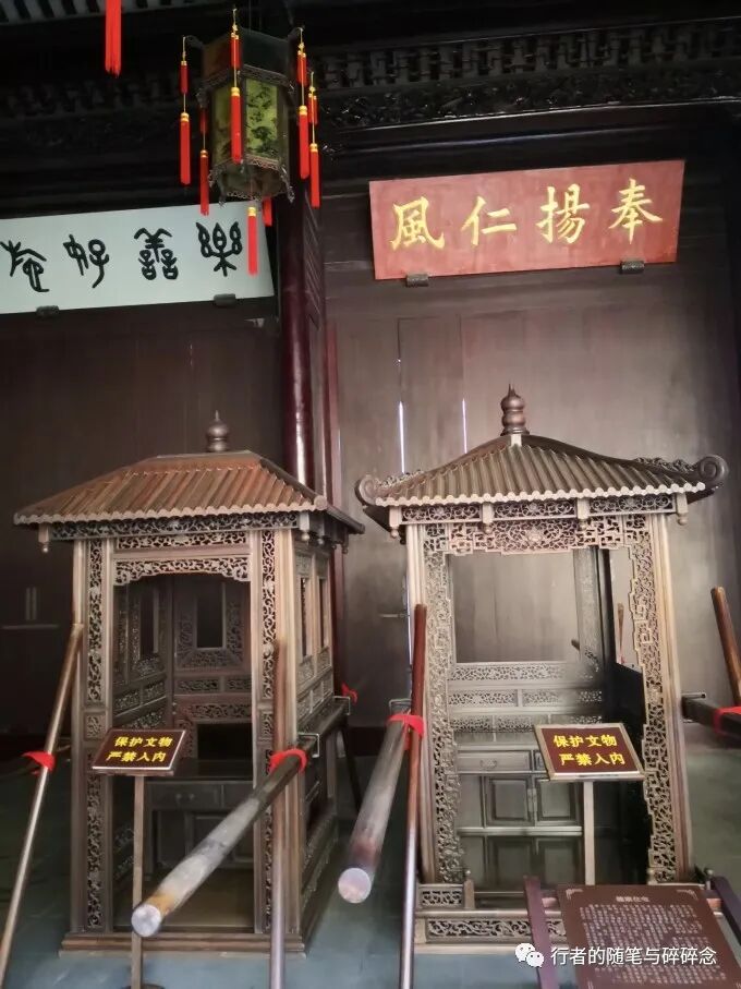 轎廳內,陳設有兩頂紅木官轎。轎寬1米,長兩米,高3米,置身轎中,仿佛坐於涼亭之內,寬敞自如。官轎的頂部四簷微翹,既像一座亭蓋,又像一頂官帽,極符合胡雪巖紅頂商人的身份。