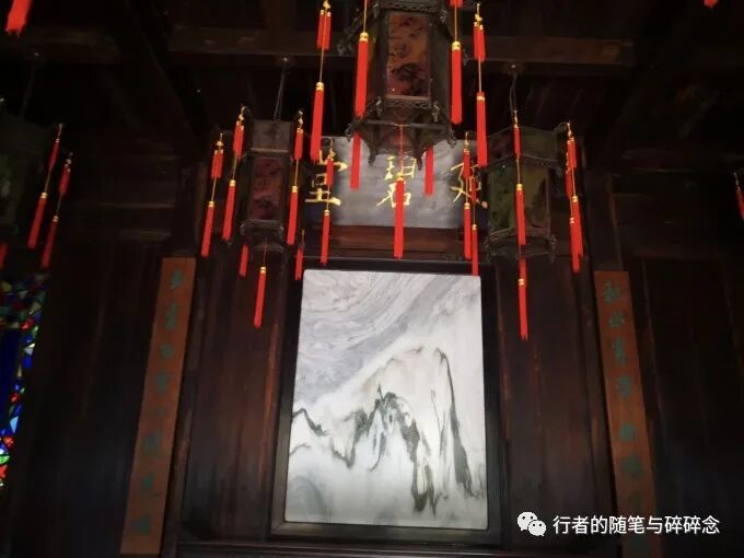 正廳中堂掛著“厚德載物”字幅,兩邊對聯:古今來色色形形無非是戲,天地間奇奇怪怪何必認真。兩邊柱上楹聯:爽借清風明借月,動觀流水靜觀山。
