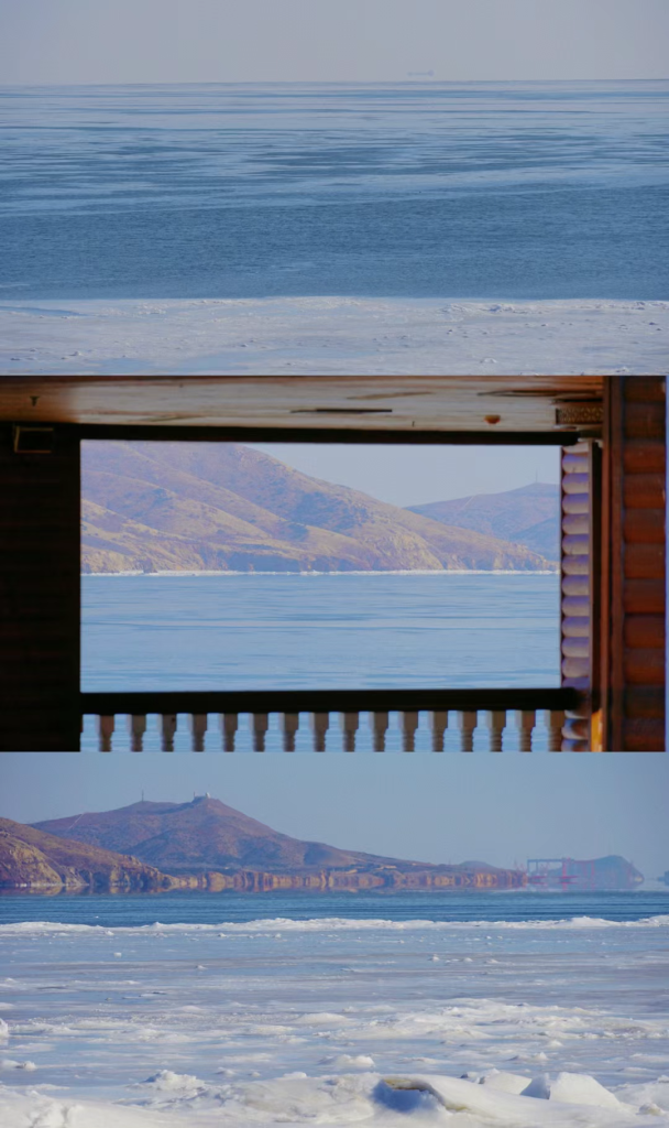 湛藍的海水,被冰封成了藍白色的凍海。入目是純淨的白,幽靜的藍,在陽光照射下,泛著閃爍的光,仿佛是一場曠遠又寧靜的夢。