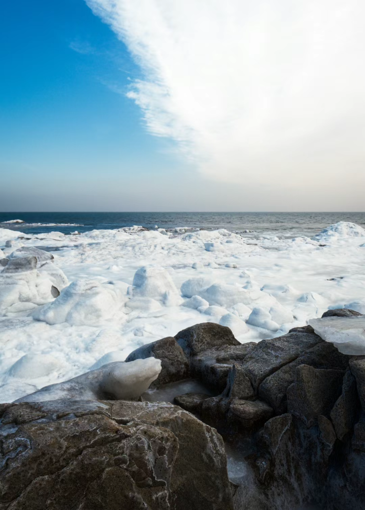 一半是靜謐海水,一半是純白堆雪,雪花與浪花彼此交織,大海就像是寂寥而憂鬱的原野,時間都仿佛在這裏凝結。