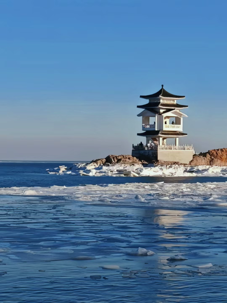 站在亭子上,看上一天的大海也不會膩煩。遠眺,是大海的無邊無際,近看,是寂寥孤獨的凍海,海水褪去了春夏的喧囂,無風卻有浪,仿佛是將一切凍結,包括時間。