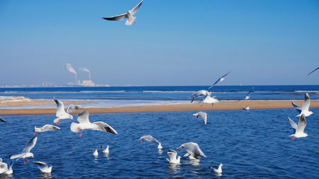 冬日的東戴河也格外浪漫,海水被白雪所覆蓋,成群海鷗回環飛旋,海風呼嘯而過,海岸藍白相間,仿佛是墜入了一幅純淨的油畫間。