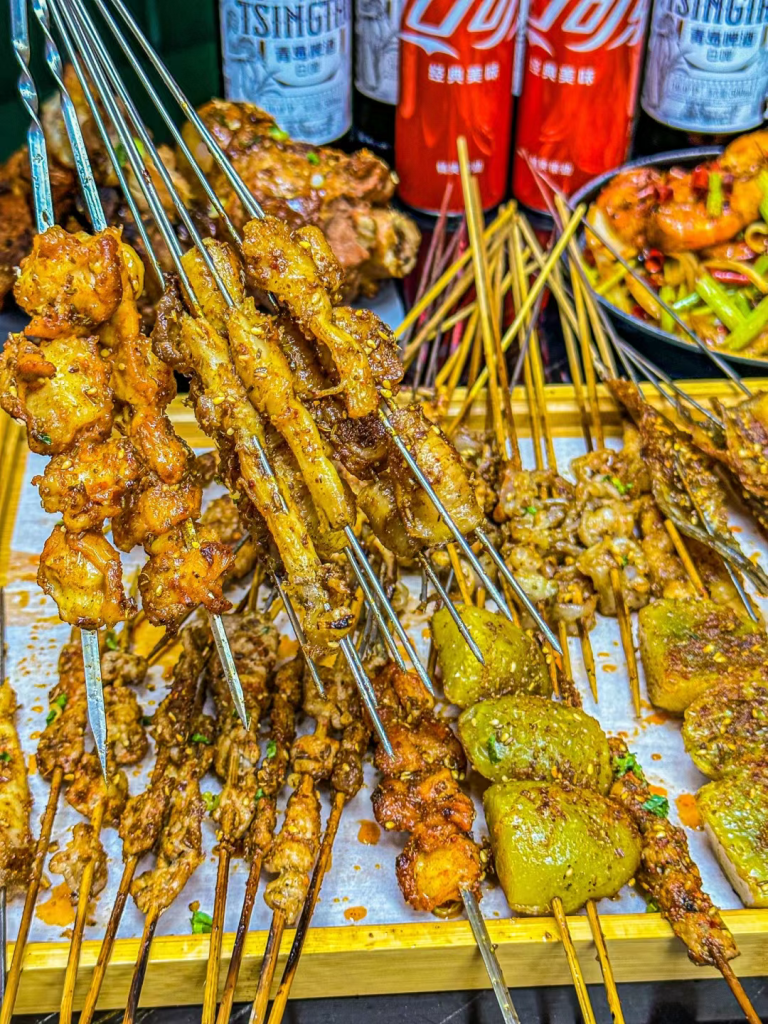 用鐵簽串起的肉串,肥瘦相間的羊肉小串,軟糯勁道的掌中寶,焦香四溢的烤雞翅,嚼勁十足的牛板筋……抹上白面、刷上蒜蓉辣醬,就在炭火間滋滋作響。