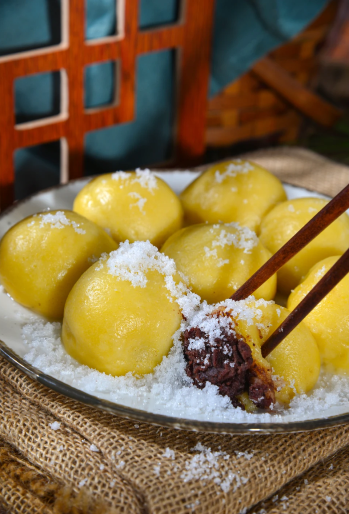 揭開鍋的刹那,白茫的霧氣撲面而來,露出一個個色澤金黃,圓潤可愛的粘豆包,蘸上些許白糖,咬上一口沙軟細膩,滿口豆香,糯嘰嘰的口感讓人回味無窮!