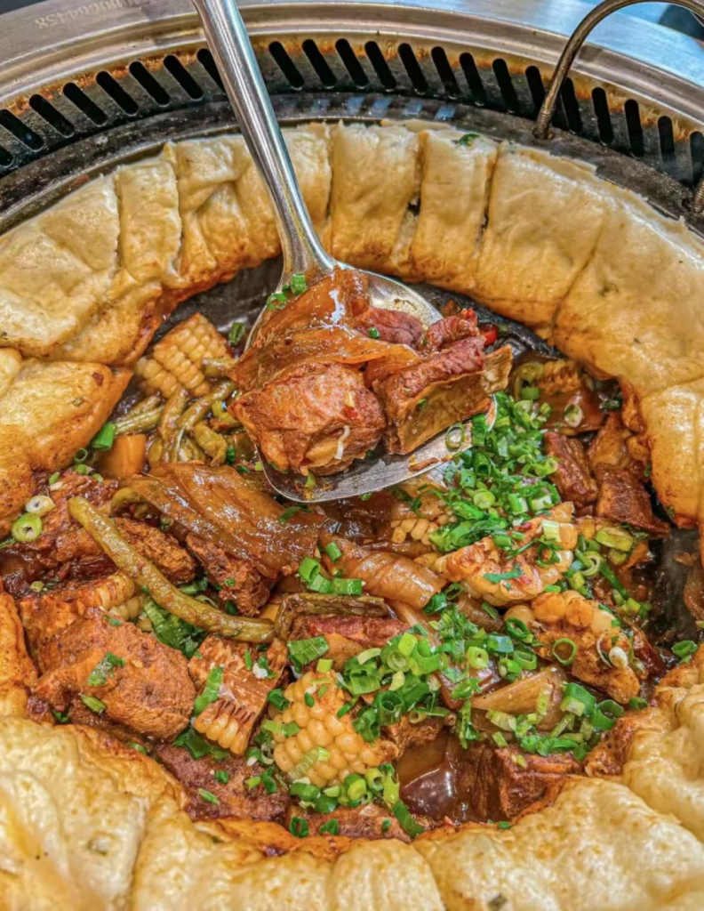 當地人也喜歡叫它“豆角蓋被”,趁著燉排骨土豆豆角的時候,把餅放進去燜熟,濃鬱的醬汁就一點點滲入了軟和的烙餅,每一口都綿軟鮮香,勁道十足!滿滿一大鍋的菜,土豆,玉米,豆角,脊骨肉被燉得酥爛鮮香,再搭配上吸飽了醬汁的軟糯烀餅,吃起來實在太過癮啦。