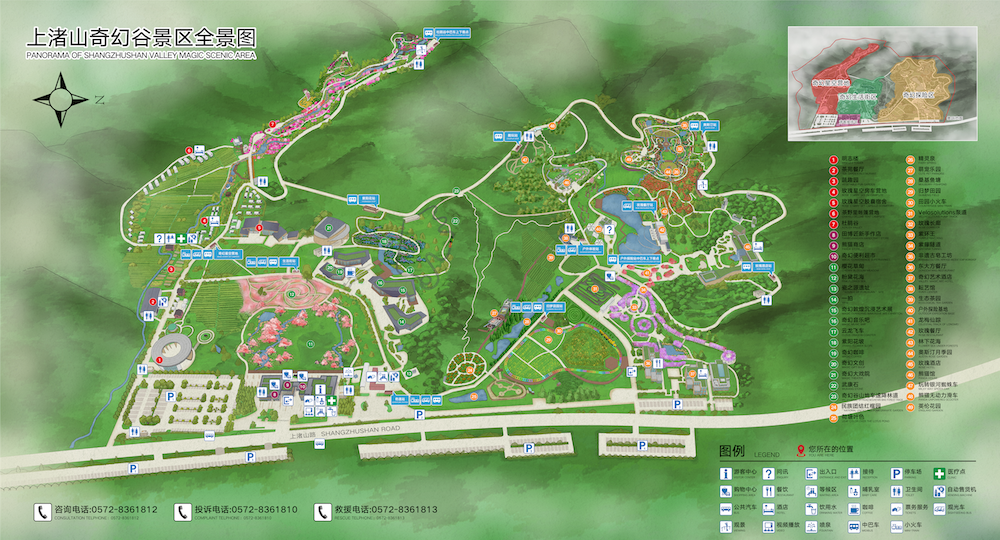 上渚山奇幻穀總用地面積約1815畝,包括田博會室內區(美麗中國館、美麗浙江館、 美麗德清館)、田園實景展示區、九曲花街、紫藤灣、奧斯汀月季園、戶外探險基地、 杜鵑穀、熊貓館等板塊。
