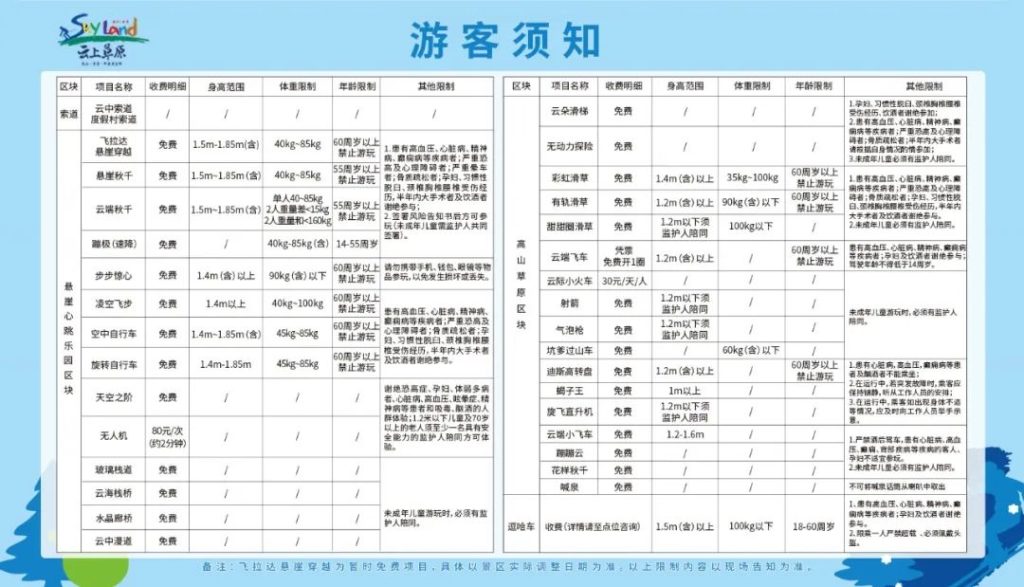 遊玩項目:暢玩30+懸崖遊樂:天空之階、 懸崖秋千、彩虹滑草空中自行車、步步驚心、懸崖蹦極、飛拉達·懸崖穿越、雲端飛車...