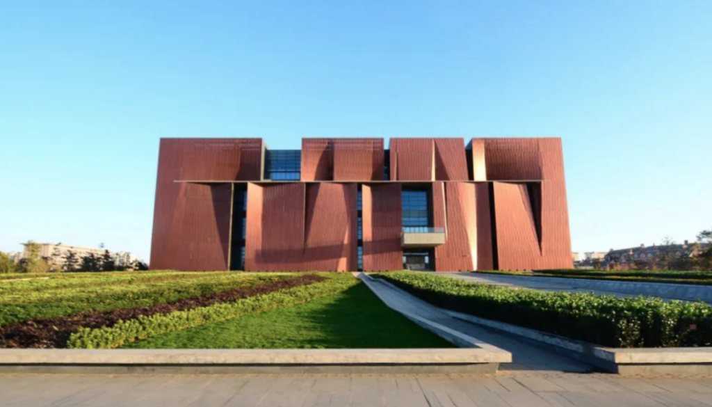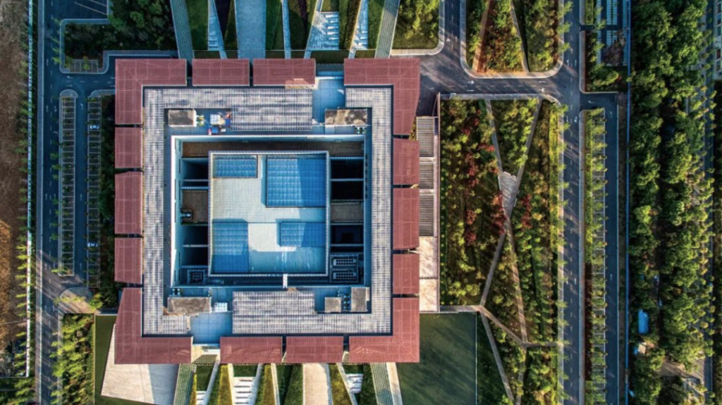 雲南省博物館新館的主體建築設計理念來源於雲南著名的“石林”,外形呈正方體,平面呈“回”字形,這是一棟取意自雲南彝族“一顆印”式的傳統民居建築,呈現出石林風化後的峻峭嶙峋,也彰顯著紅土高原的獨特美感。