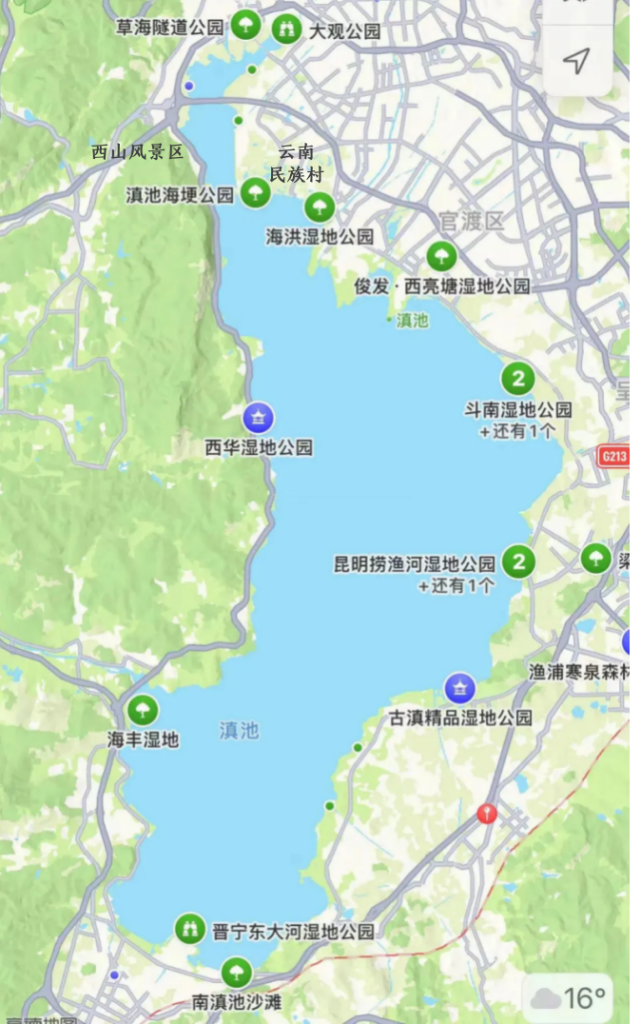 滇池,位於昆明市西南,亦稱昆明湖、昆明池、滇南澤、滇海,是地震斷層陷落型湖泊。因其水勢倒流,故稱為滇,其外形似一彎新月。