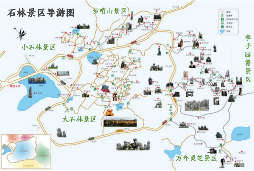 石林風景區劃分為大石林、小石林、步哨山、李子園箐、萬年靈芝五個區。