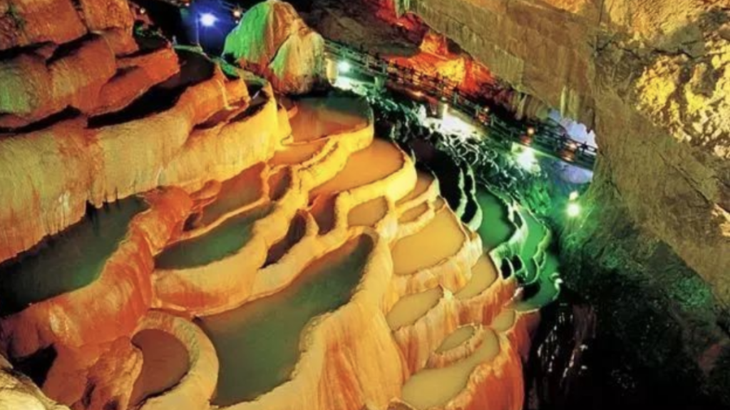 神田,由於地下水流沿洞壁斜坡片狀向下流動遇到阻擋,使水中二氧化碳氣體逸出,碳酸鈣堆積形成的層層梯田狀的鍾乳凝石,仿佛自然形成的梯田,因此被稱作神田。