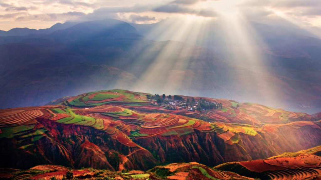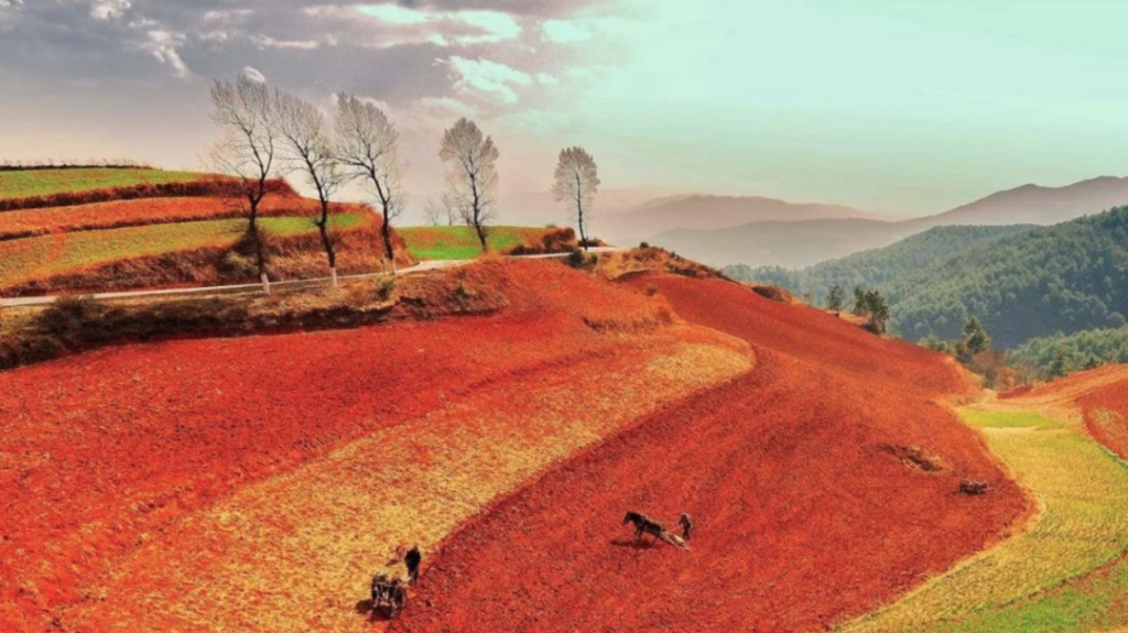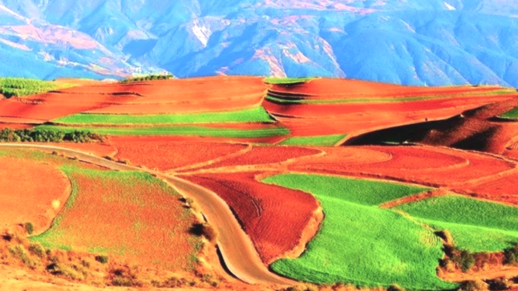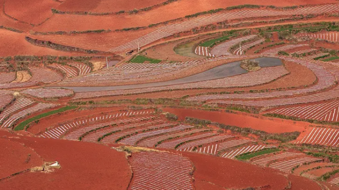 東川紅土地,位於昆明市東川區,距離昆明市區約250公裏,主要景點在海拔1800至2600之間。雲南地處溫暖濕潤的環境,土壤裏的鐵質經過氧化慢慢沉積下來,逐漸形成了炫目的色彩,被稱為“上帝的神奇調色板”。