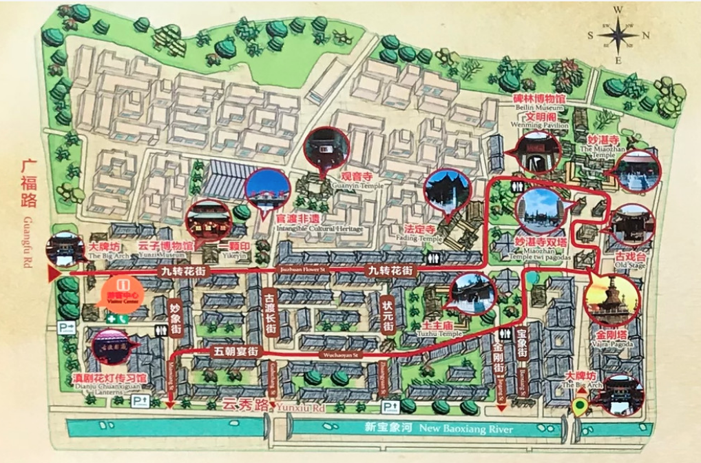 官渡古鎮文化古跡眾多, 人文景觀豐富,不到1.5平方公裏的范圍內,就有唐、宋、元、明、清時期的“五山”“六寺”“七閣”“八廟”等多處景觀以及上百間保存完好的“一顆印式”民居,古時有“小雲南”之稱。