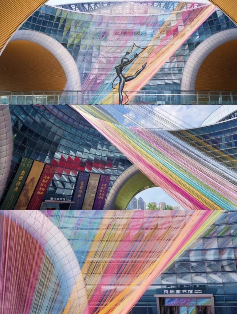萬卷平山海,一筆落驚鴻!嘉興文化藝術中心太美啦!以長虹橋為創作靈感,汲取秀洲水鄉橋元素,呈現書山、書海、書橋景象,並結合多媒體影像技術,為讀者呈現“書海架長虹”的視覺盛宴。