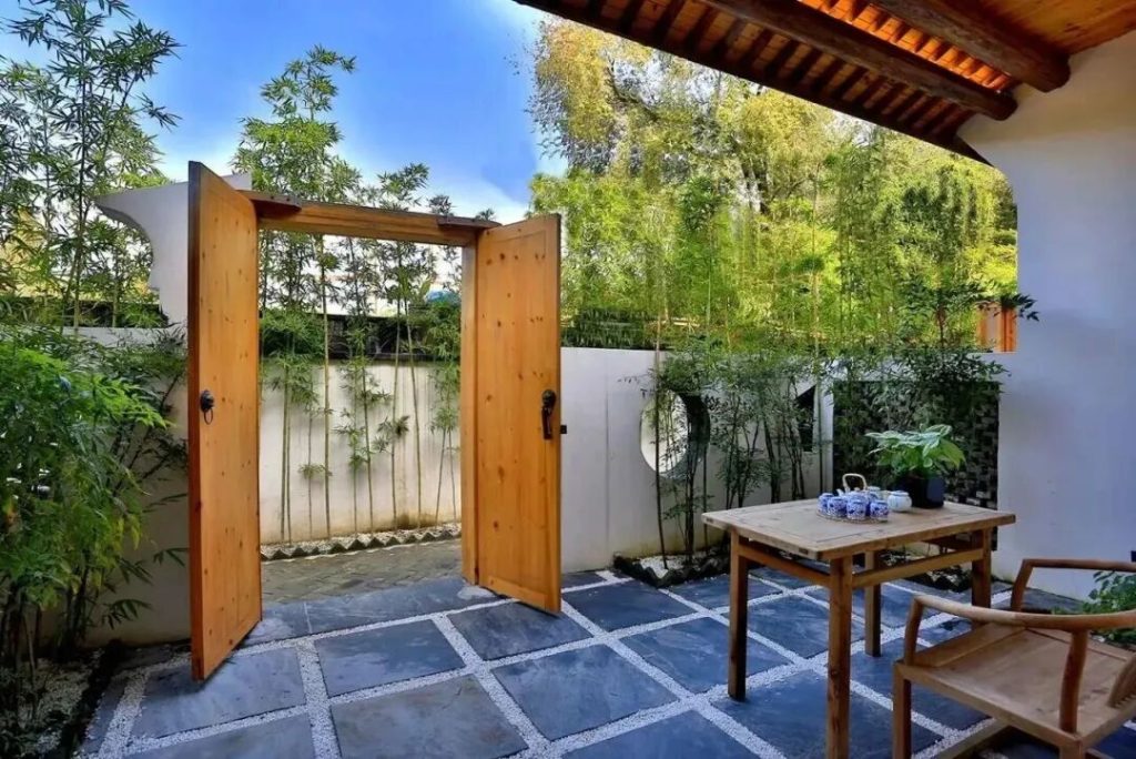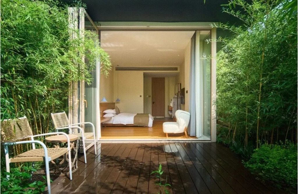 而飛鳥集度假村藏在4A級銀杏天鵝湖景區裏,3萬株銀杏環繞千畝湖域,10棟獨立院落全是寵物友好型。