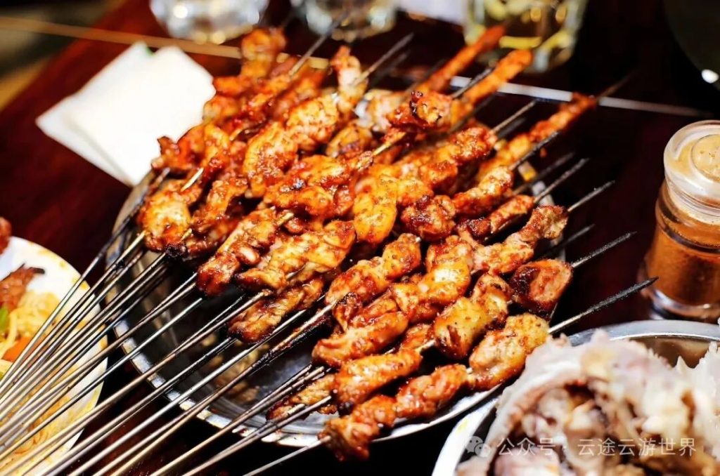 選用當地新鮮羊肉,有烤羊排、烤羊腰、烤板筋等多種選擇,經炭火烤制,外皮金黃酥脆,內裏鮮嫩多汁,撒上孜然和辣椒面,香氣撲鼻,是嘉峪關最具煙火氣的美食。