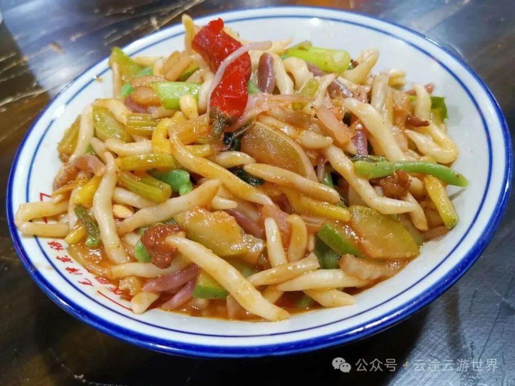 將面團搓成兩頭尖的“小魚”形狀,煮熟後可幹拌或炒食,搭配甜椒炒肉或番茄炒蛋,面條筋道彈牙,吸滿醬汁,是河西走廊的面食精髓。