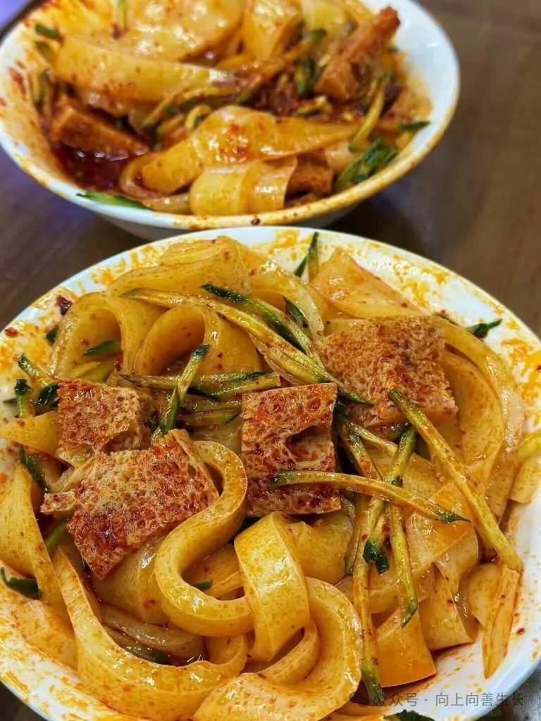 西北涼皮的“高階版”,由洗面筋後的澱粉蒸制而成,質地厚實柔韌,切條後拌入芝麻醬、蒜水、辣椒油,面筋吸飽湯汁,酸辣開胃,街頭巷尾的小攤都能吃到。