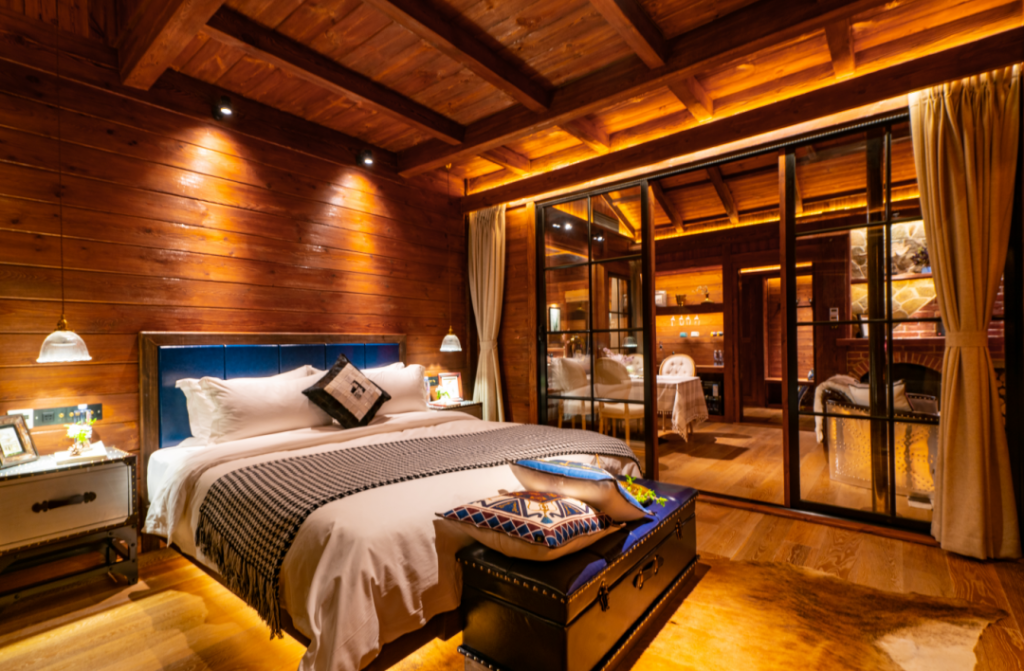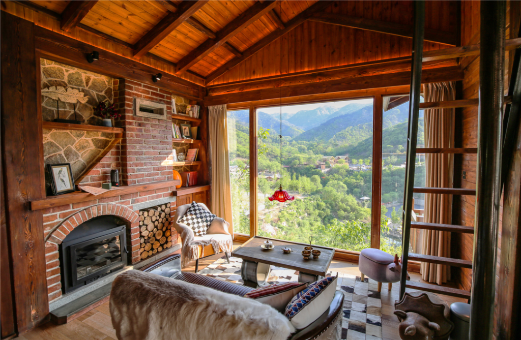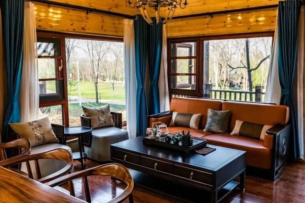 伸手所能觸及到的房屋主體結構都是采用純實木榫卯結構打造,步入室內,杏黃的燈光映襯出溫馨的色調,皮質的沙發正對可以俯瞰整片森林的落地窗。